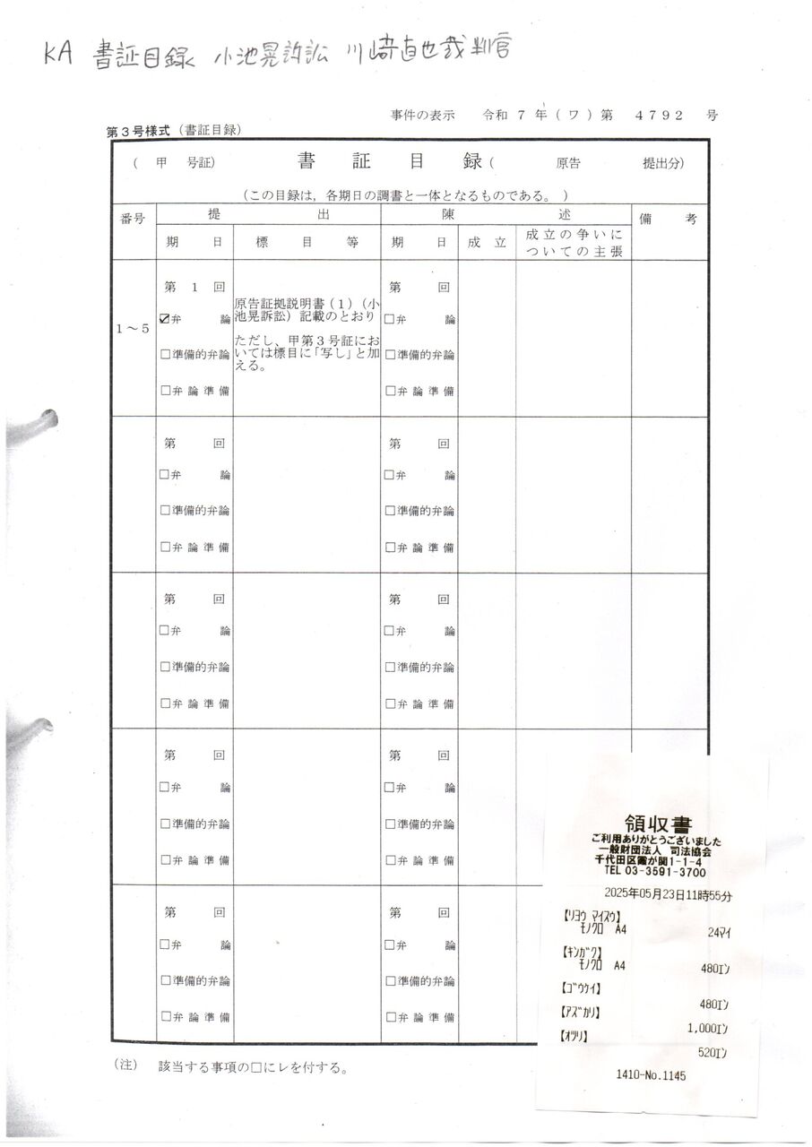Ⓢ 画像版 KY給付 230427 第1回口頭弁論調書 岡田幸人裁判官 小池百合子(島田謙二) 告訴状を受理しろ