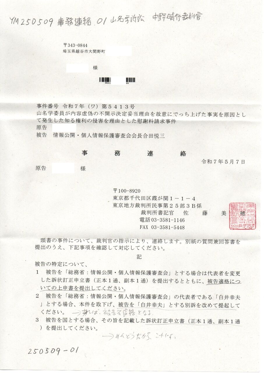 □ YM250509事務連絡 山名学訴訟 中野晴行裁判官 佐藤美穂書記官<2p>