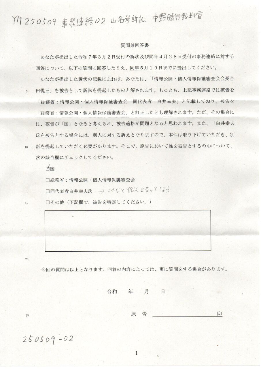 Ⓢ YM 250401 事務連絡に対する回答 山名学訴訟