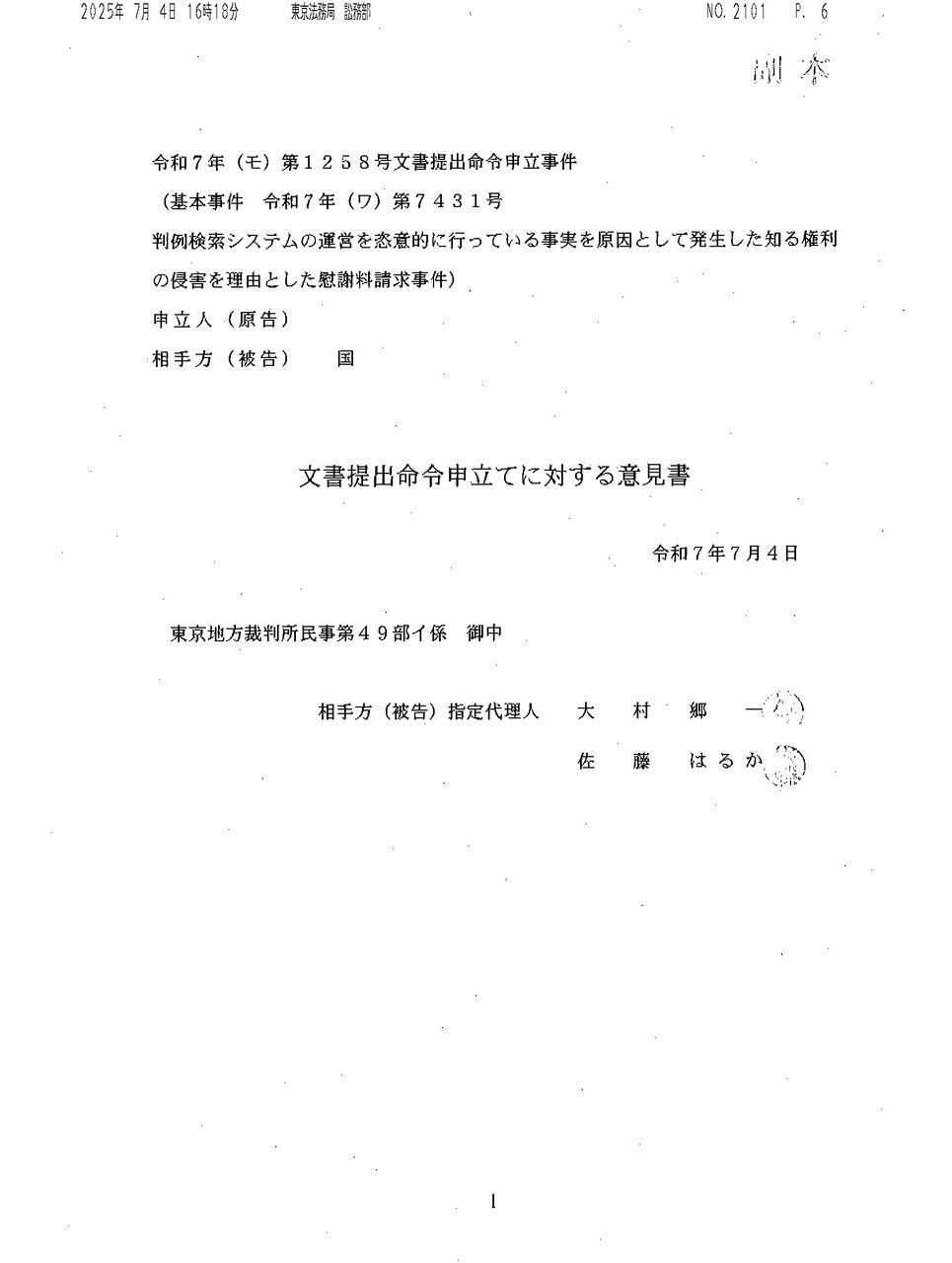 画像版 SK 250704 文提に対する意見書 鈴木馨祐訴訟=判例検索訴訟 佐藤隆行裁判官 佐藤はるか訟務官