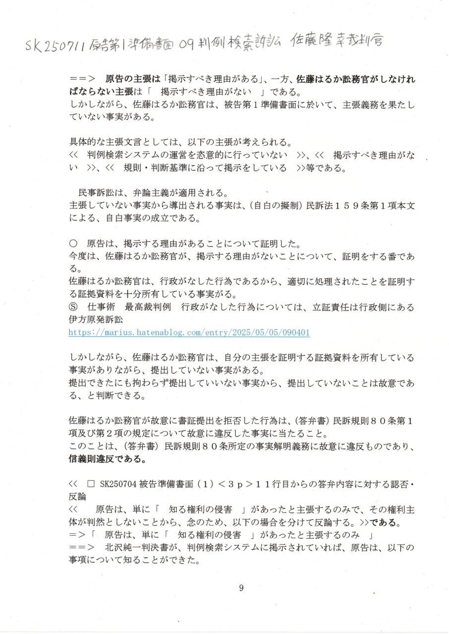 9 SK 250711 原告第1準備書面 09判例検索訴訟 佐藤隆幸裁判官