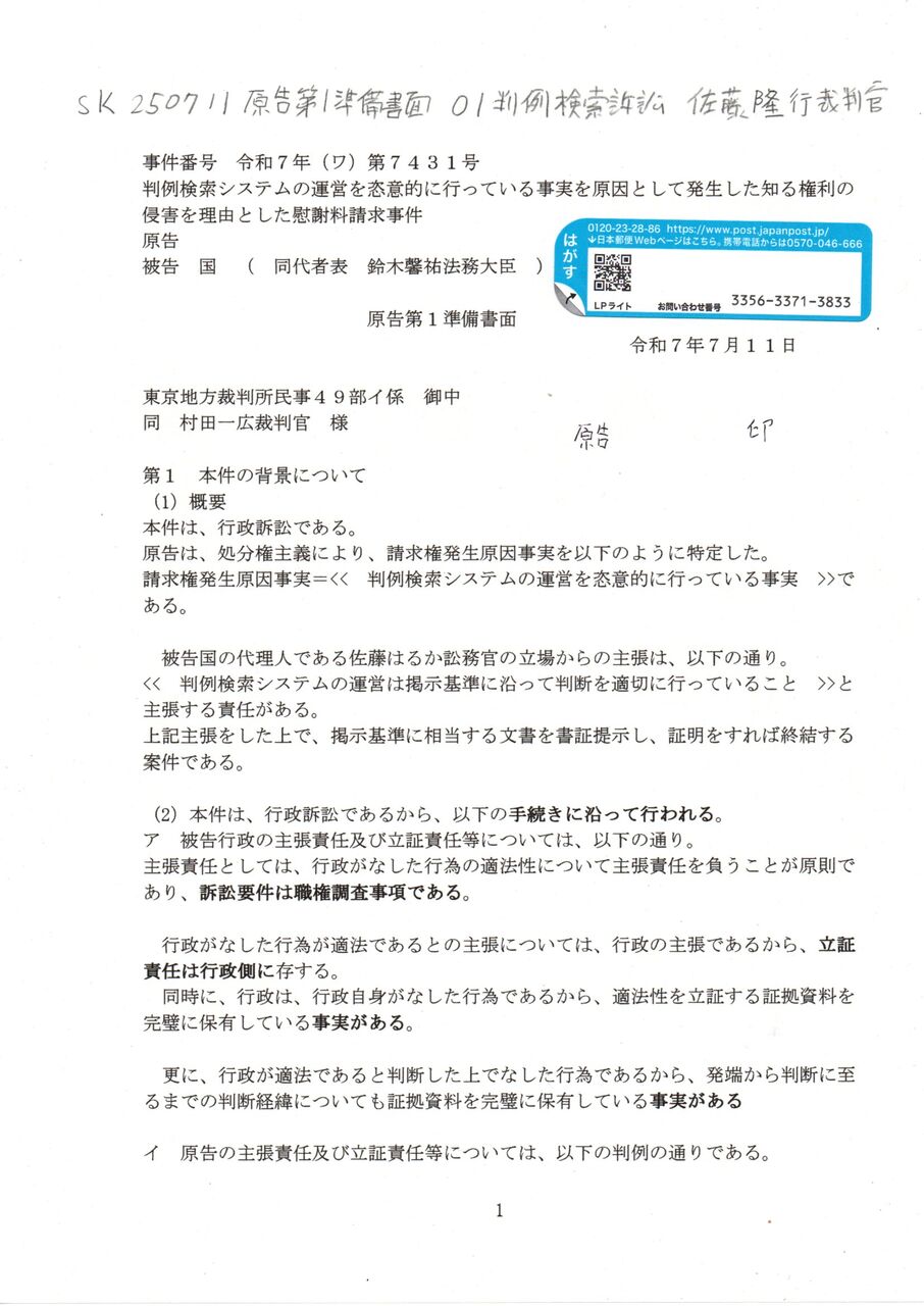 Ⓢ テキスト版 SK 250711 原告第1準備書面 判例検索訴訟 佐藤隆幸裁判官