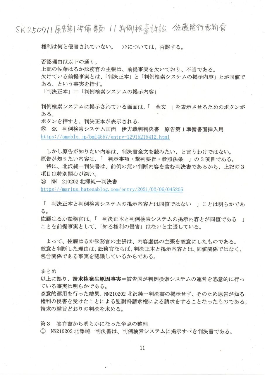 11 SK 250711 原告第1準備書面 11判例検索訴訟 佐藤隆幸裁判官