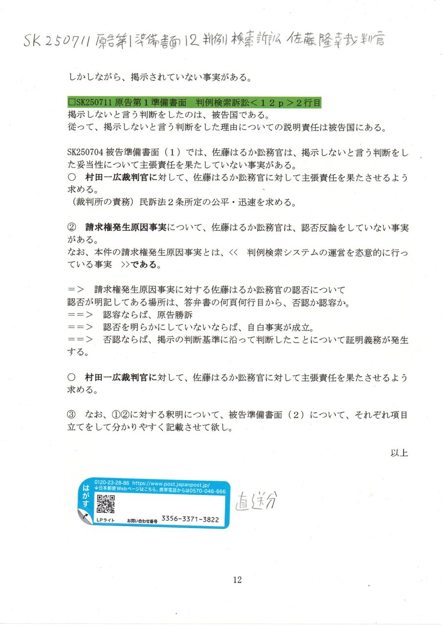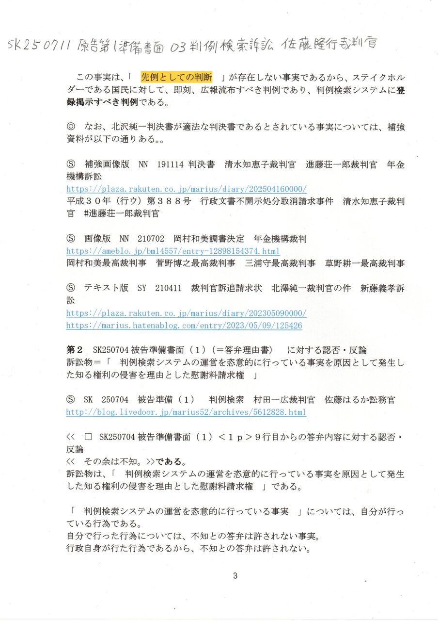 画像版 SK 250711 原告第1準備書面 判例検索訴訟 佐藤隆幸裁判官 佐藤はるか訟務官 被告準備書面(1)に対する認否反論 村田一広裁判官=>佐藤隆幸裁判官