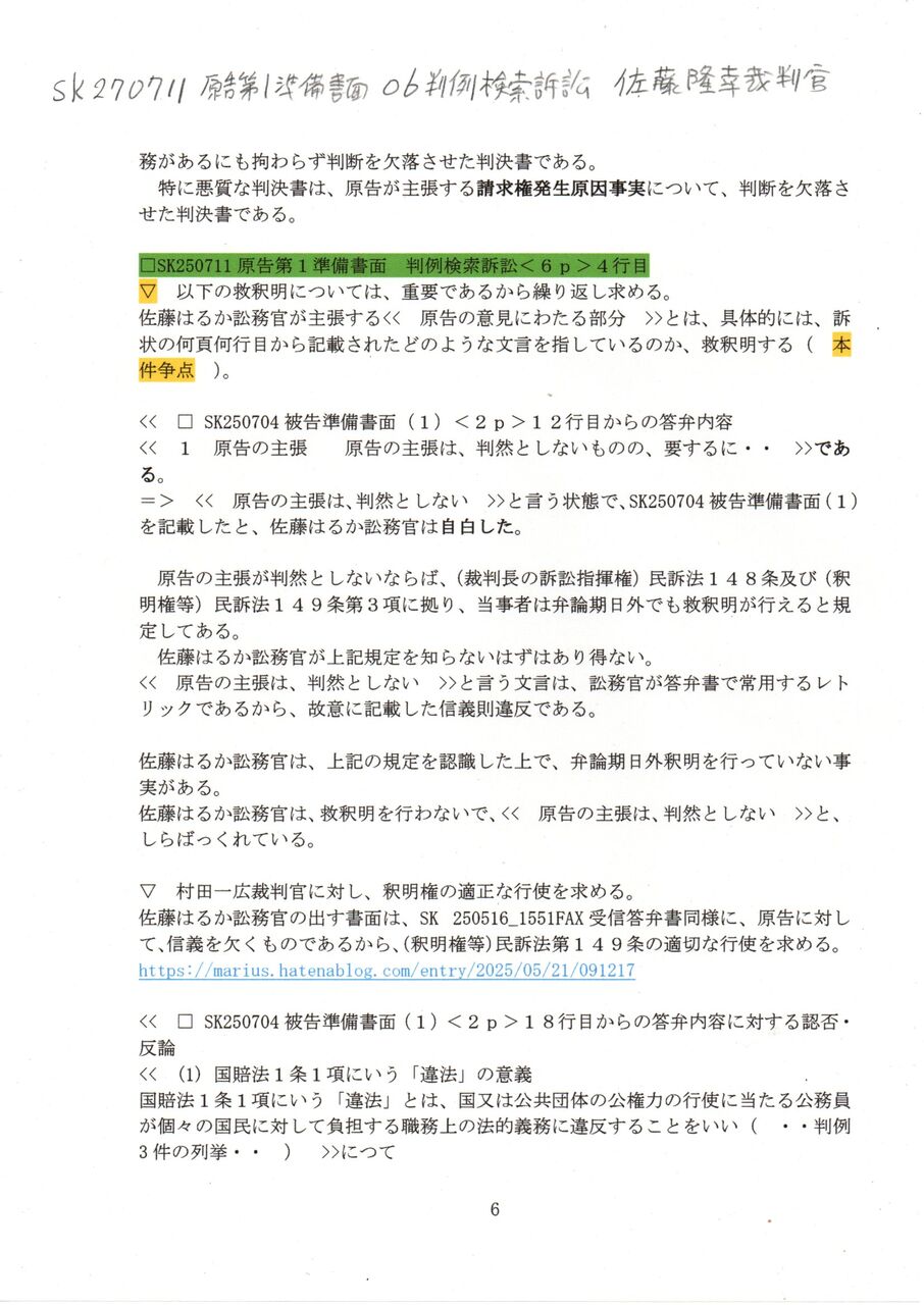 6 SK 250711 原告第1準備書面 06判例検索訴訟 佐藤隆幸裁判官