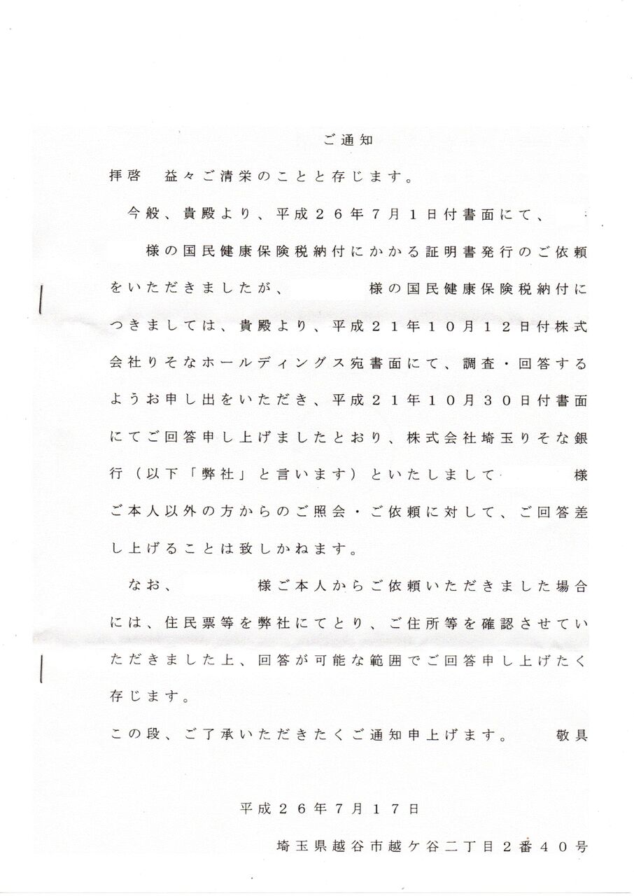 H260717 内容証明 りそな銀行越谷支店長 久保埜良幸 くぼの 国保税二重取り