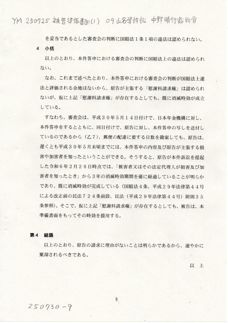 9 YM 250725 被告準備書面(1) 09中野晴行裁判官 山名学訴訟