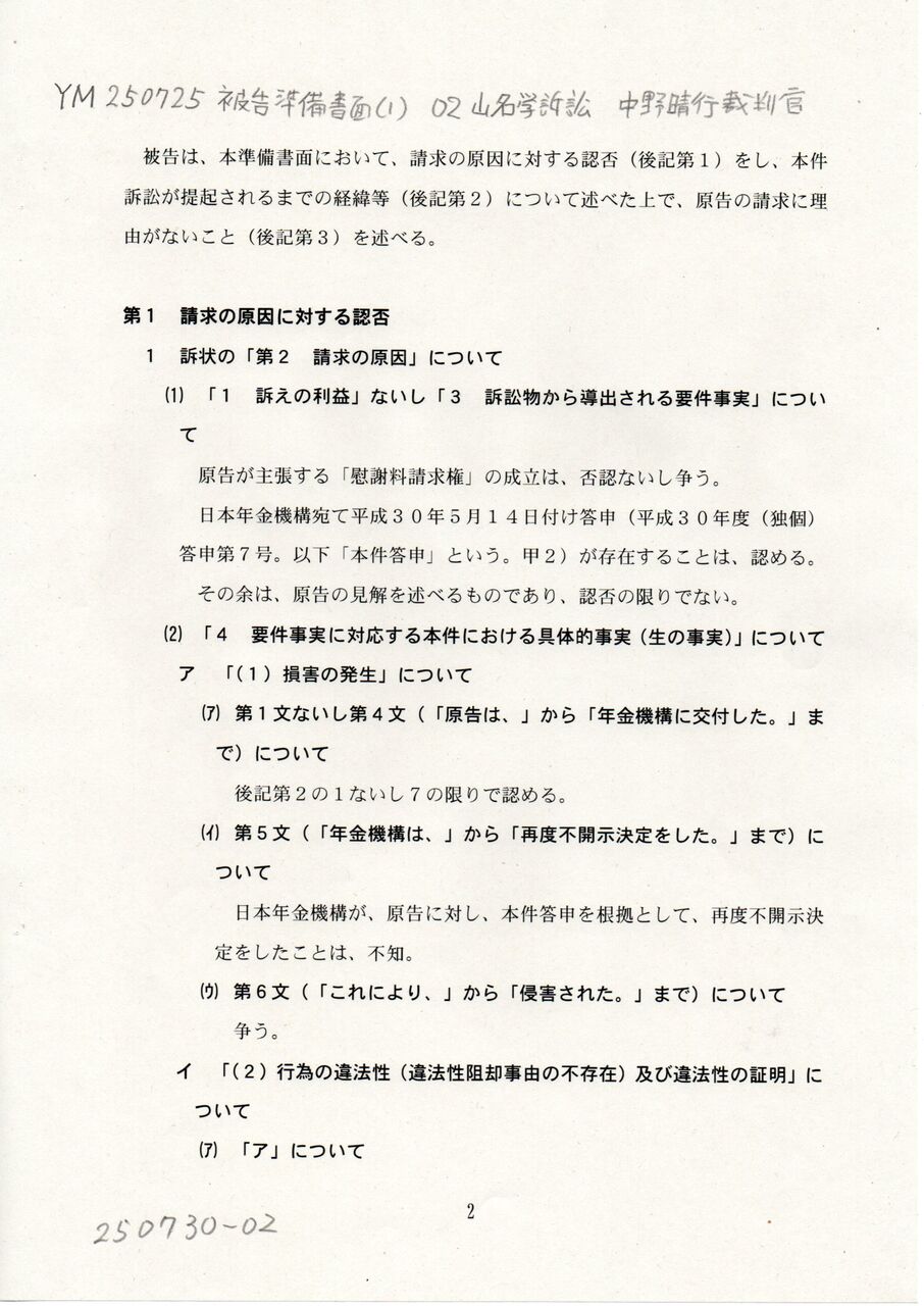 2 YM 250725 被告準備書面(1) 02中野晴行裁判官 山名学訴訟