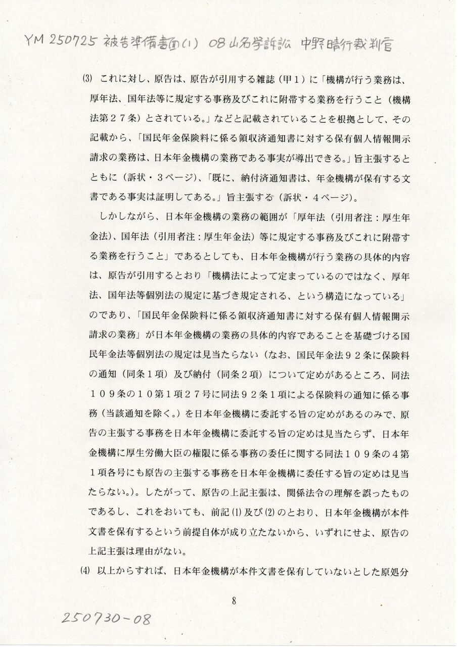 8 YM 250725 被告準備書面(1) 08中野晴行裁判官 山名学訴訟