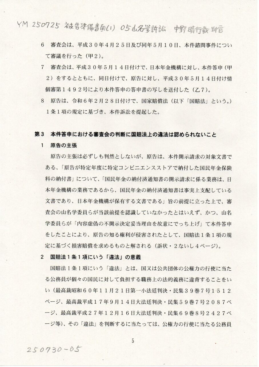 5 YM 250725 被告準備書面(1) 05中野晴行裁判官 山名学訴訟
