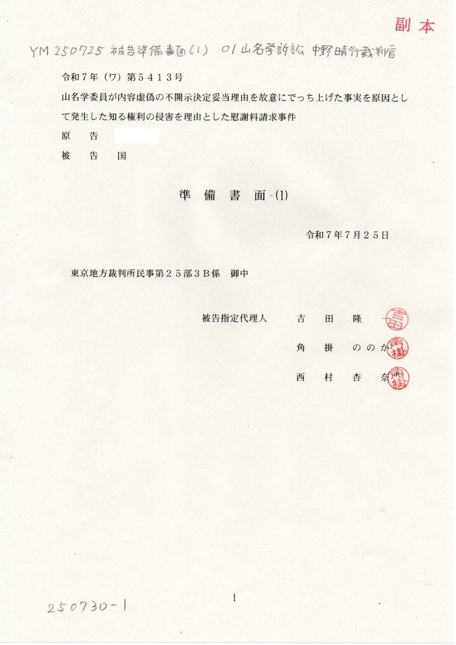 1 YM 250725 被告準備書面(1) 01中野晴行裁判官 山名学訴訟