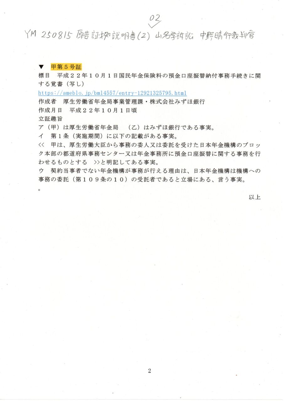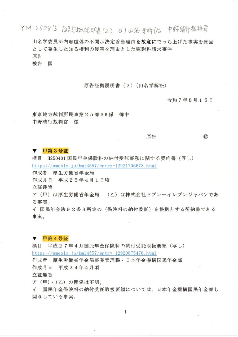 画像版 YM 250815 原告証拠説明書(2) 山名学訴訟 中野晴行裁判官
