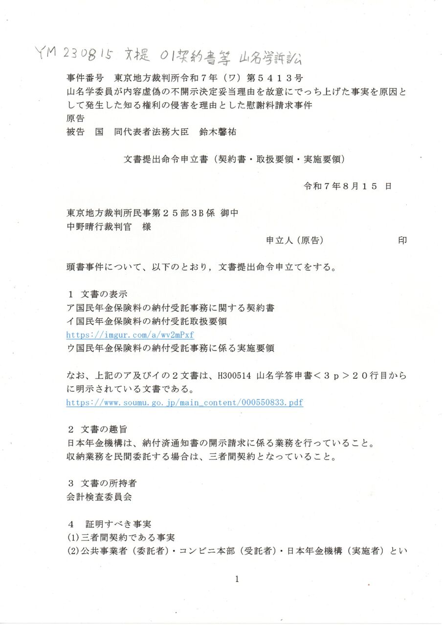 画像版 YM 250815 文書提出命令申立書 山名学訴訟 中野晴行裁判官