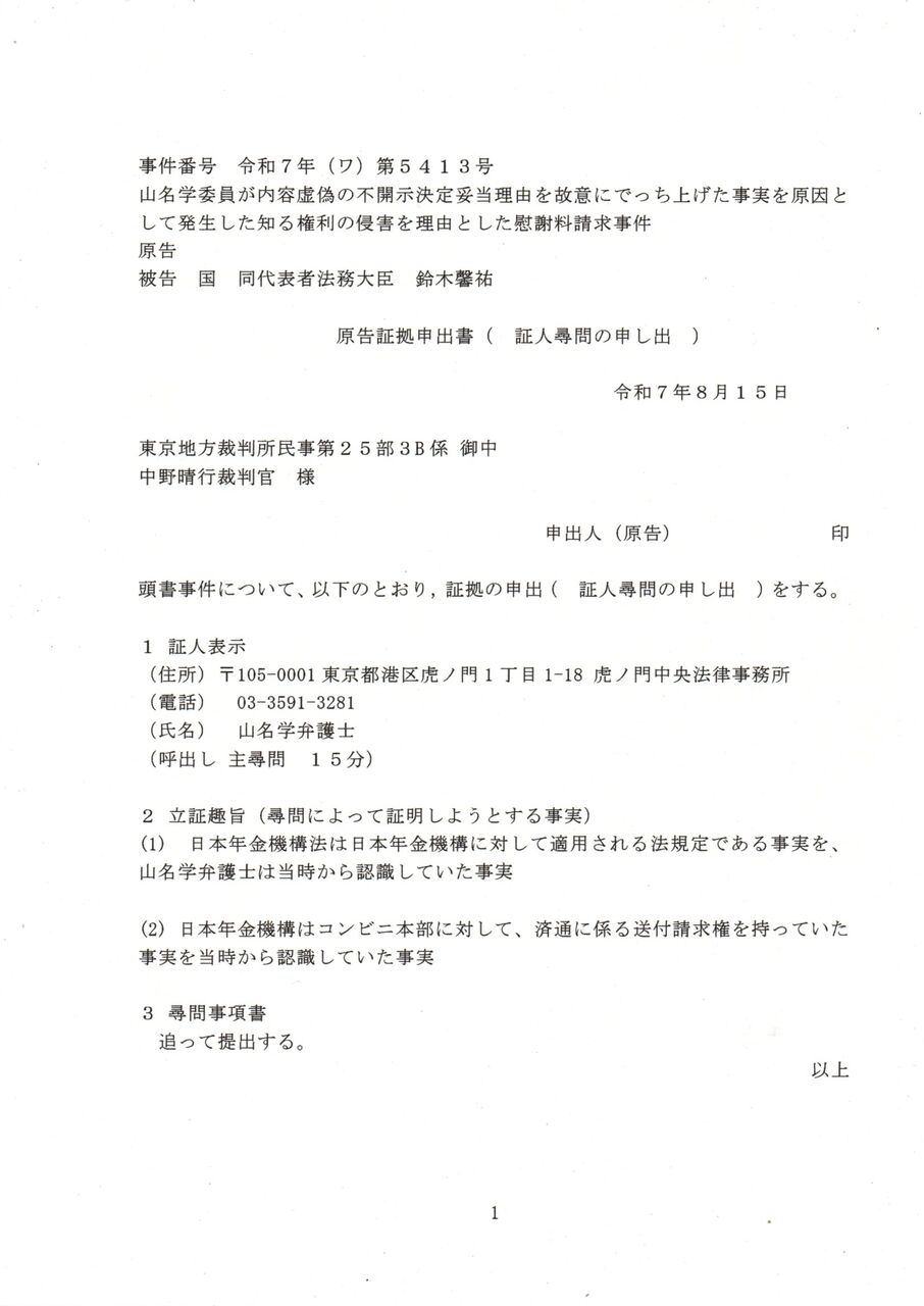 画像版 YM 250815 山名学委員 証拠申出書(証人尋問) 山名学訴訟 中野晴行裁判官