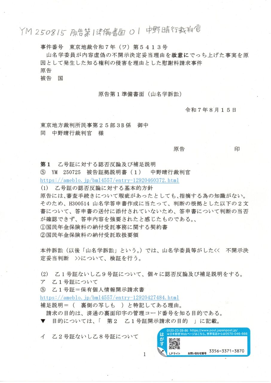 Ⓢ テキスト版 YM 250815 原告第1準備書面 中野晴行裁判官 山名学訴訟