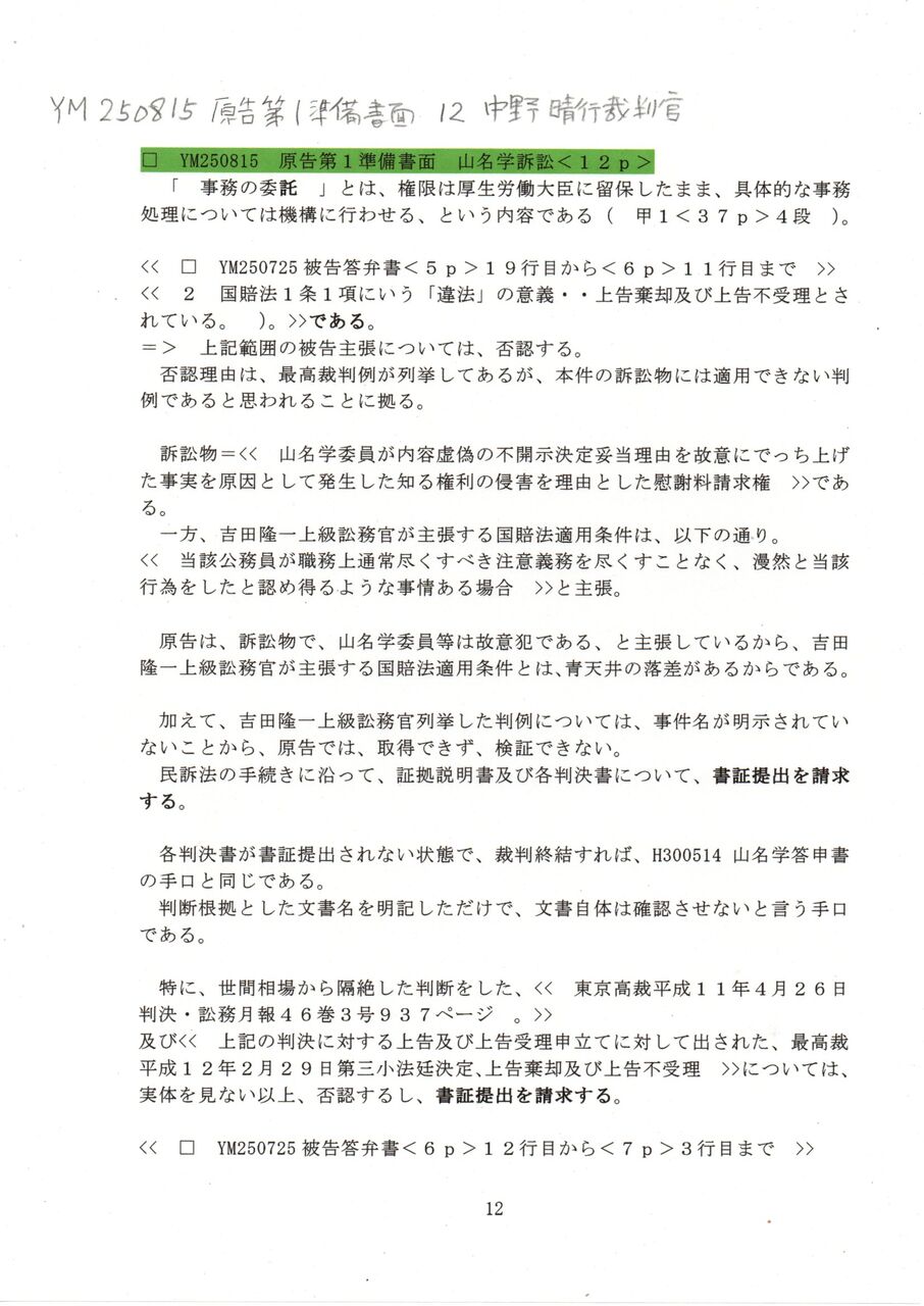 12 YM 250815 原告第1準備書面 12中野晴行裁判官