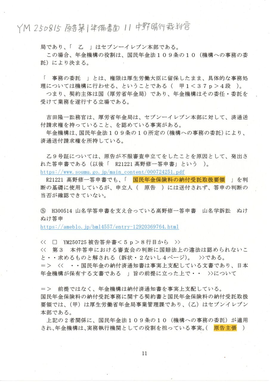 11 YM 250815 原告第1準備書面 11中野晴行裁判官
