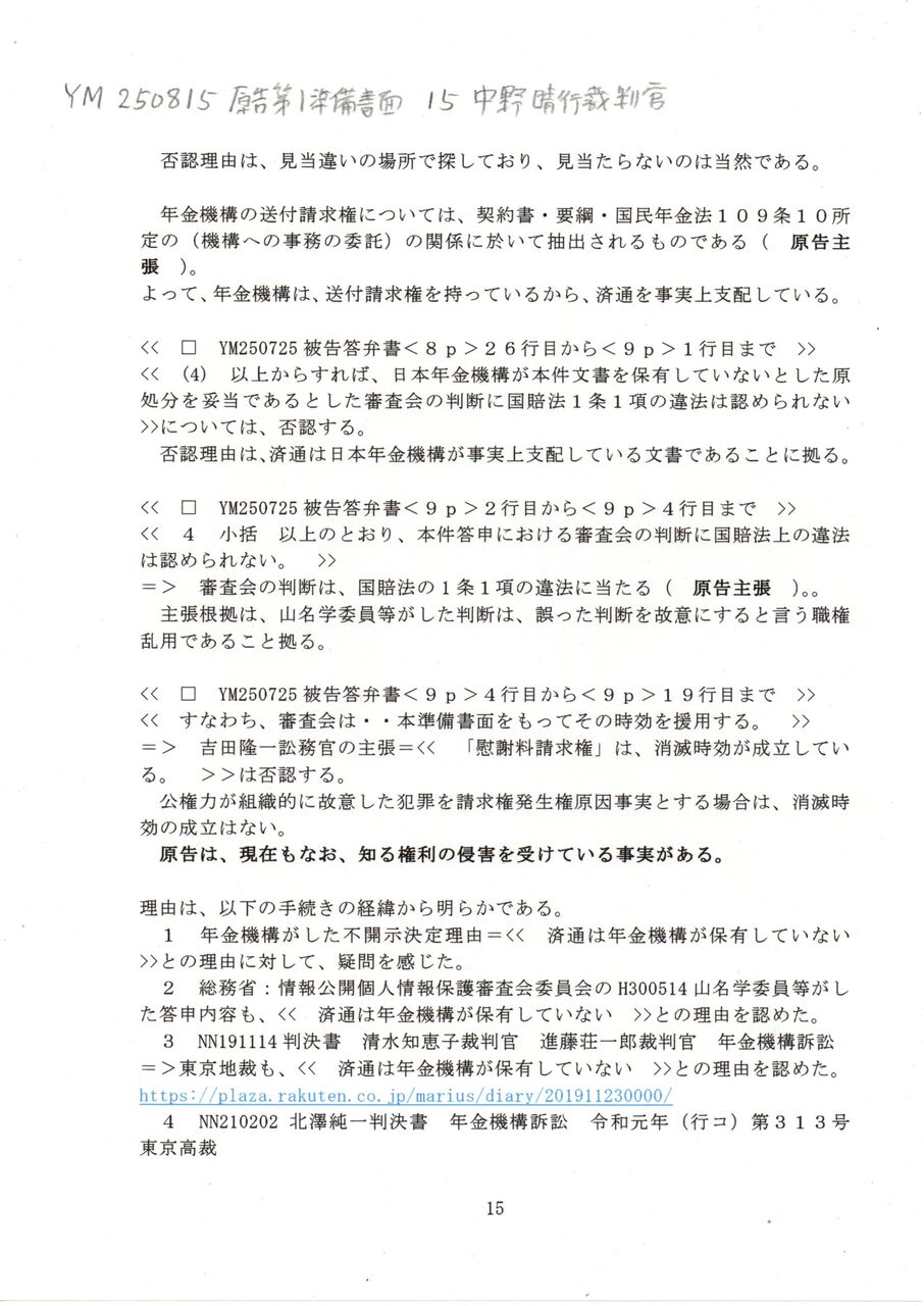 15 YM 250815 原告第1準備書面 15中野晴行裁判官