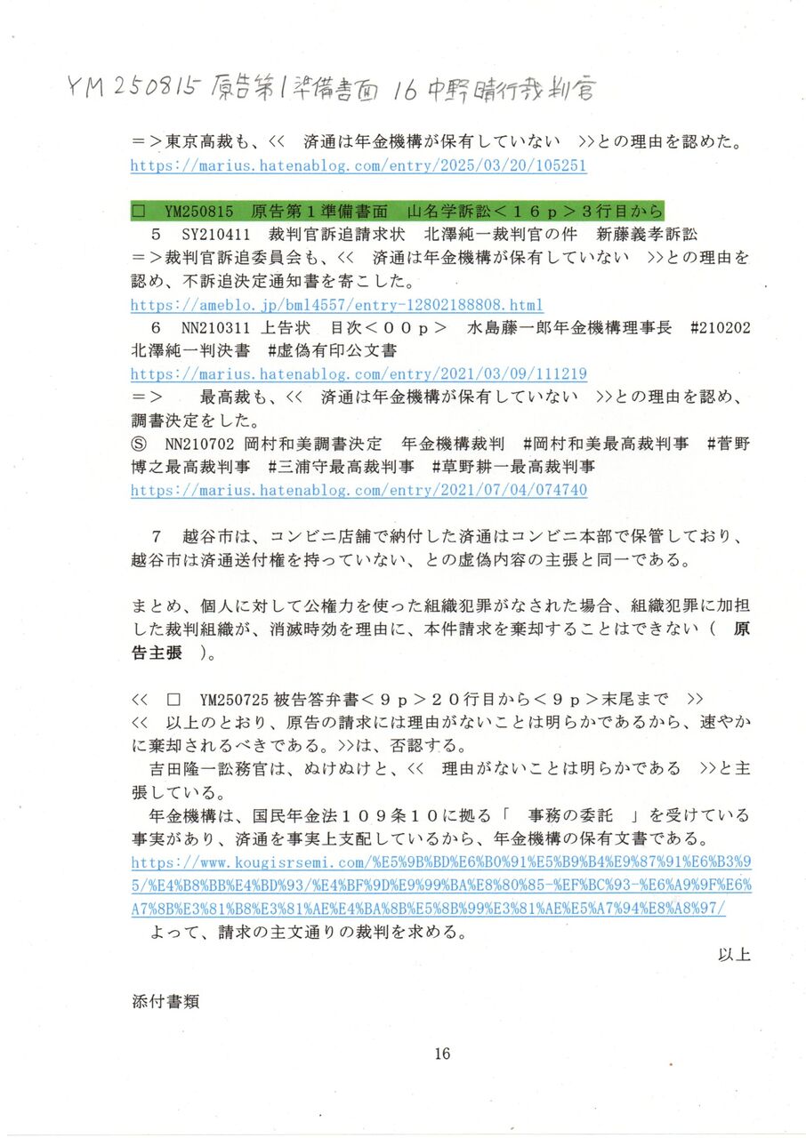 16 YM 250815 原告第1準備書面 16中野晴行裁判官