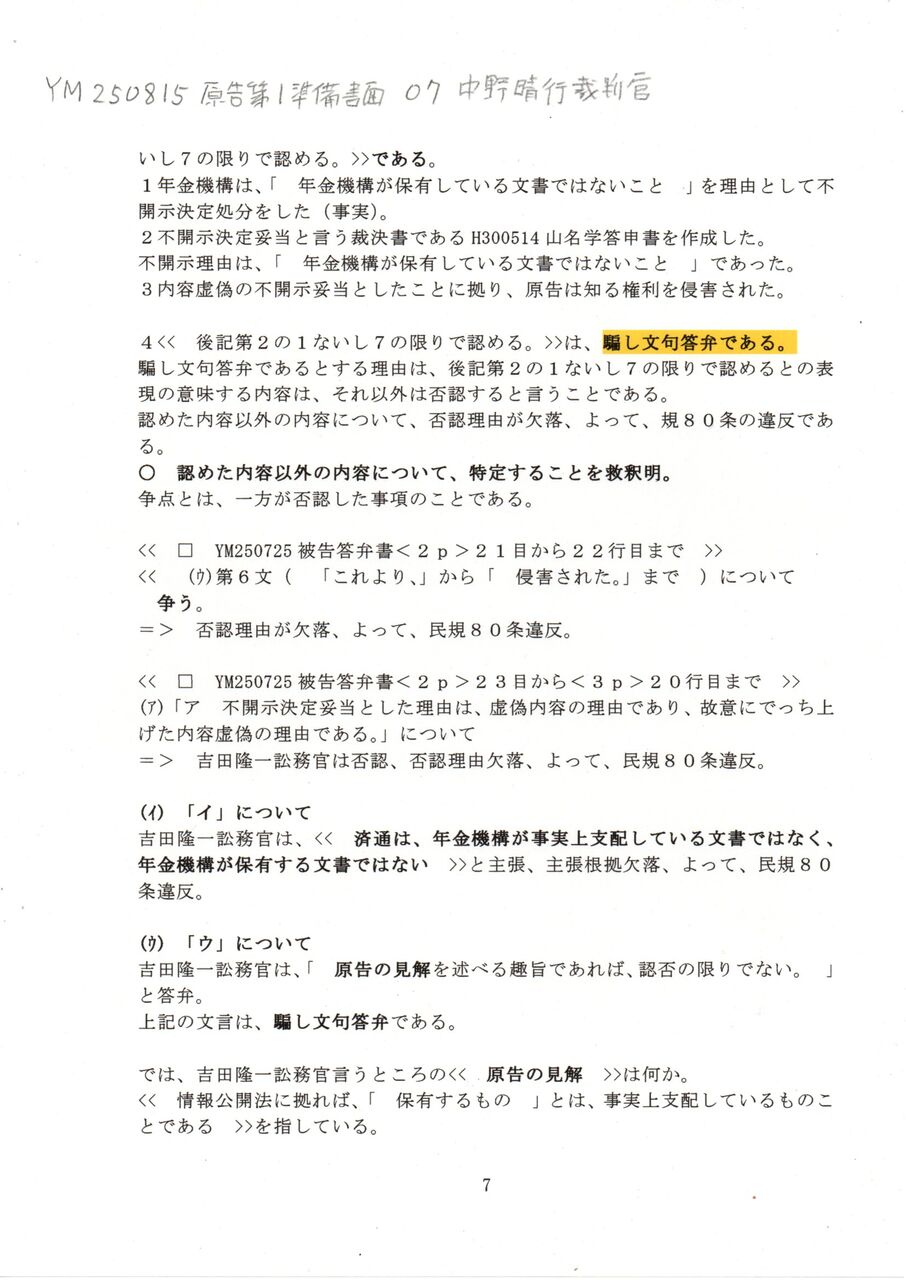7 YM 250815 原告第1準備書面 07中野晴行裁判官