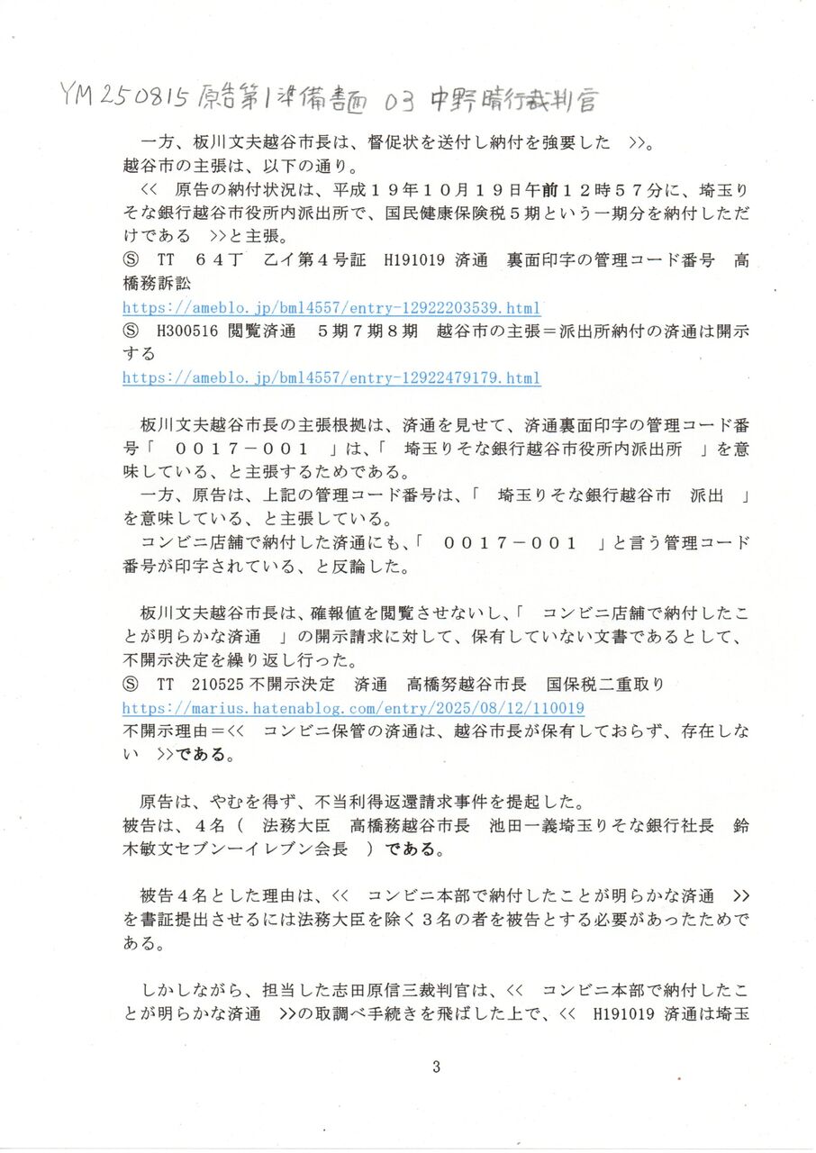 3 YM 250815 原告第1準備書面 03中野晴行裁判官