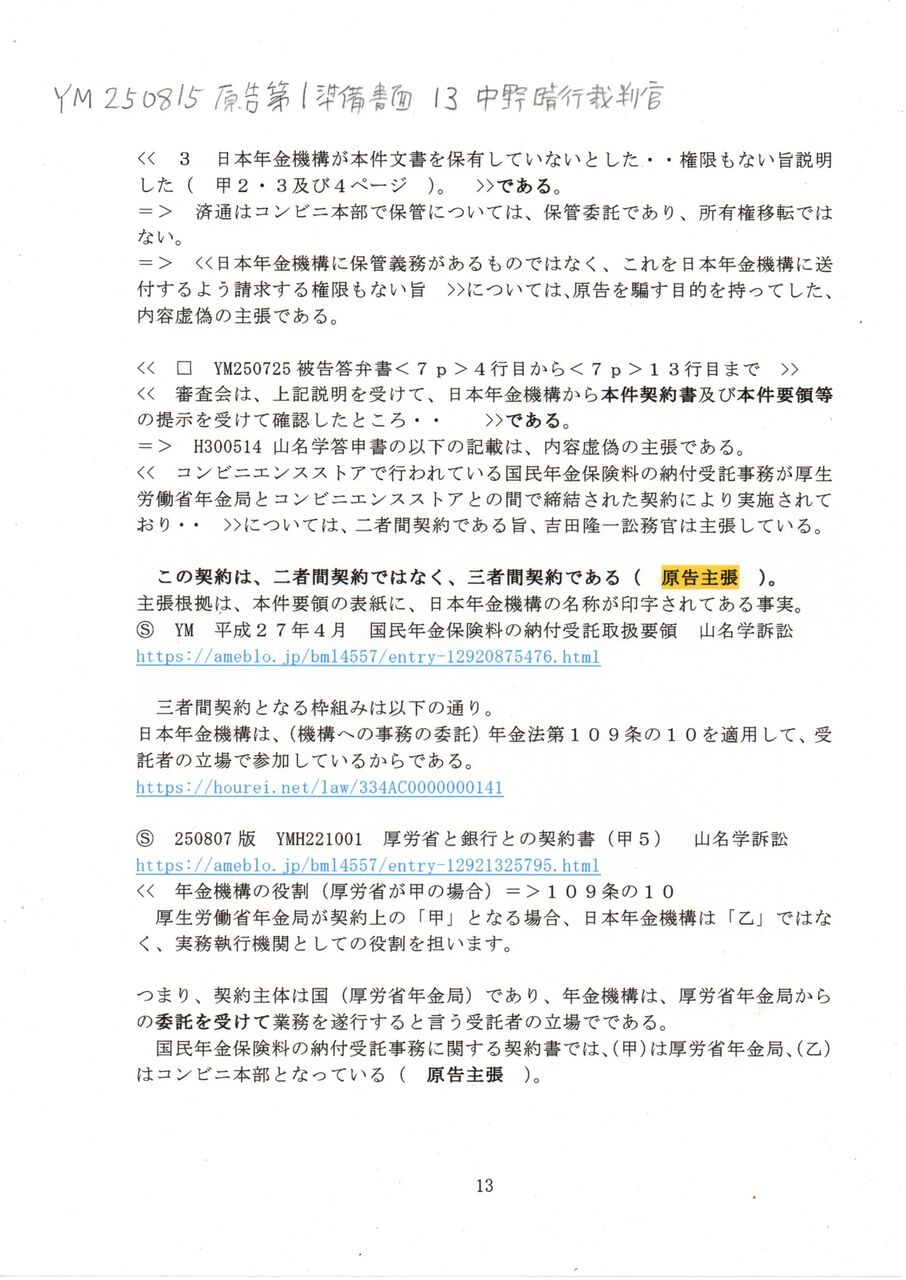 13 YM 250815 原告第1準備書面 13中野晴行裁判官