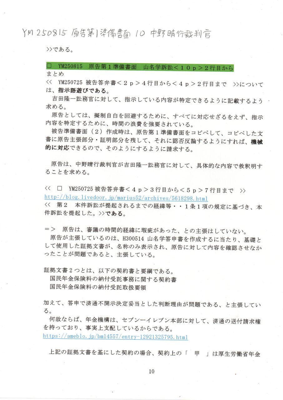 10 YM 250815 原告第1準備書面 10中野晴行裁判官