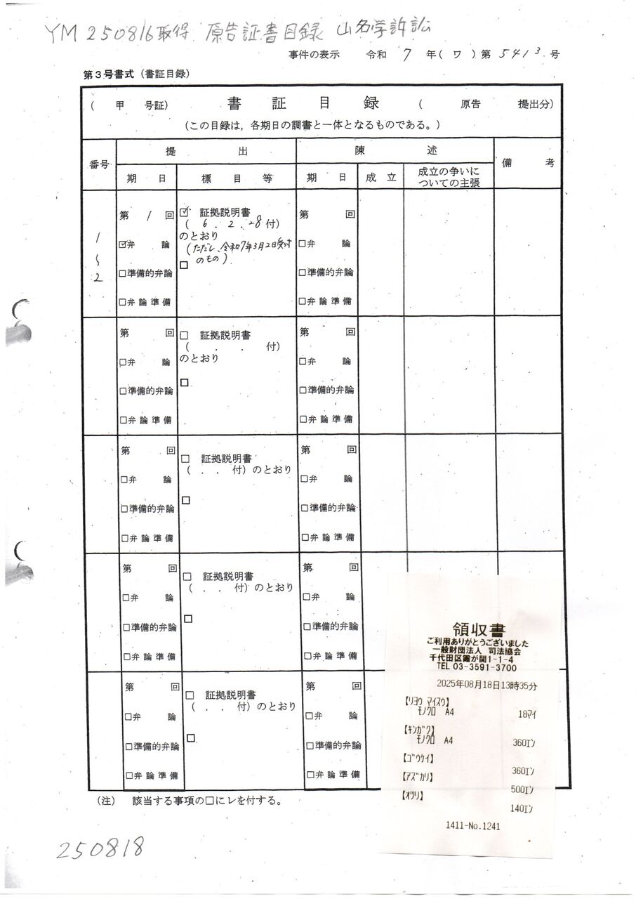 1 YM 250818取得 原告書証目録 01山名学訴訟 中野晴行裁判官