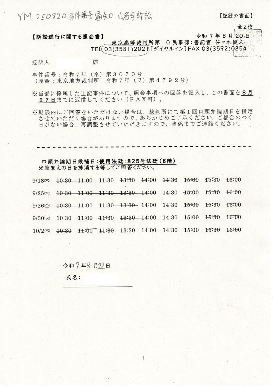 画像版 YM 250820 事件番号通知 山名学訴訟 春名茂カンバック