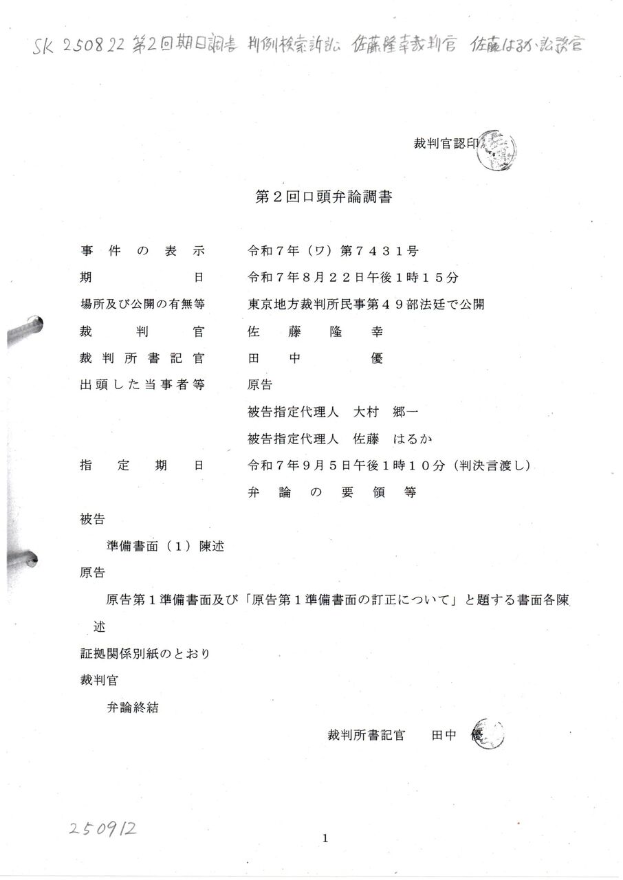 3 SK 250822第2回期日調書 判例検索訴訟 佐藤隆行裁判官
