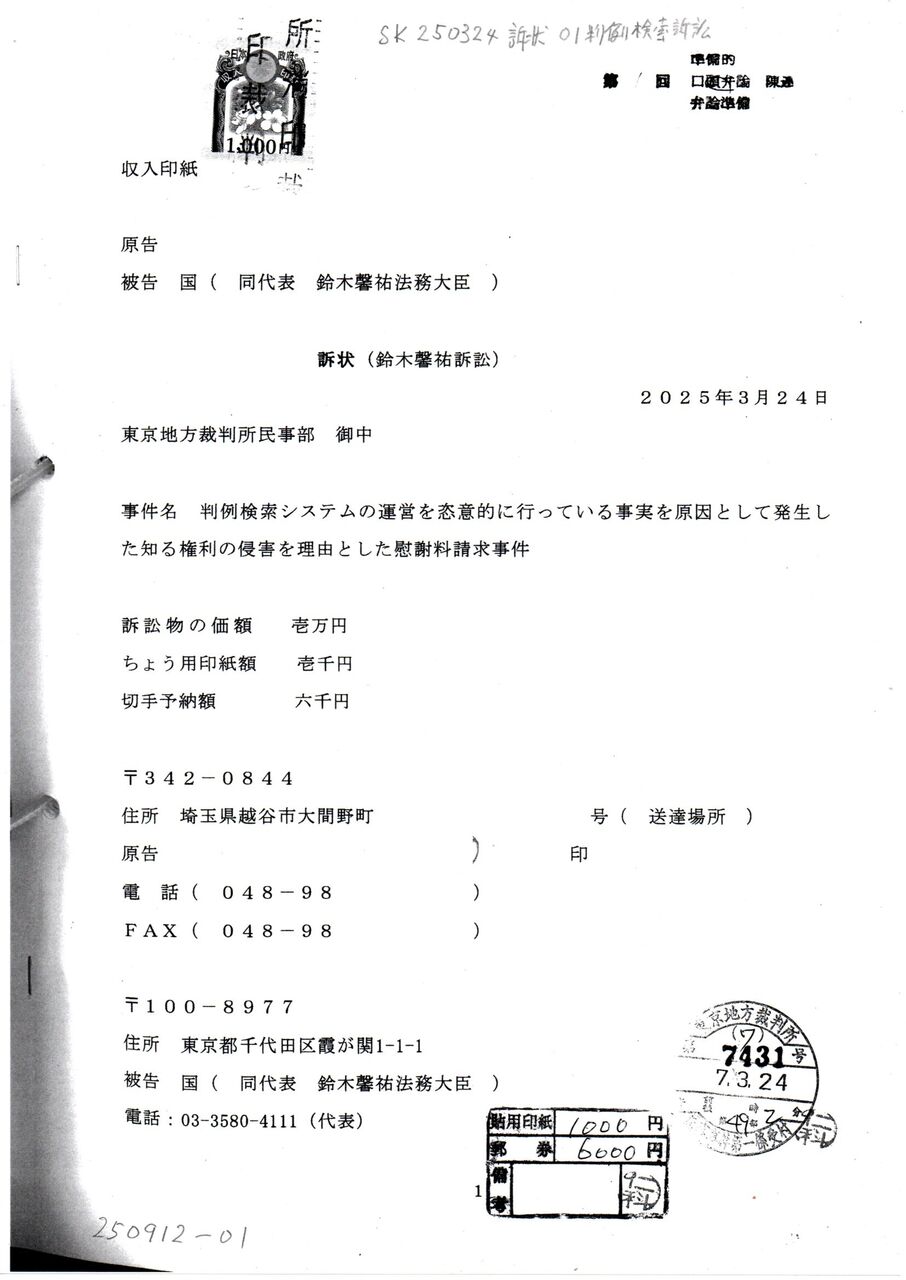 1 収入印紙添付 SK 250324 訴状 01判例検索訴訟