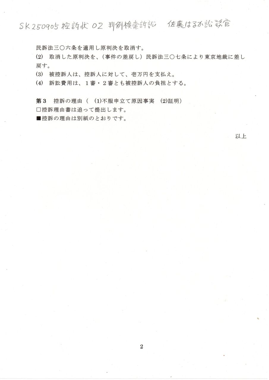 画像版 SK 250905 控訴状 判例検索訴訟 佐藤はるか訟務官