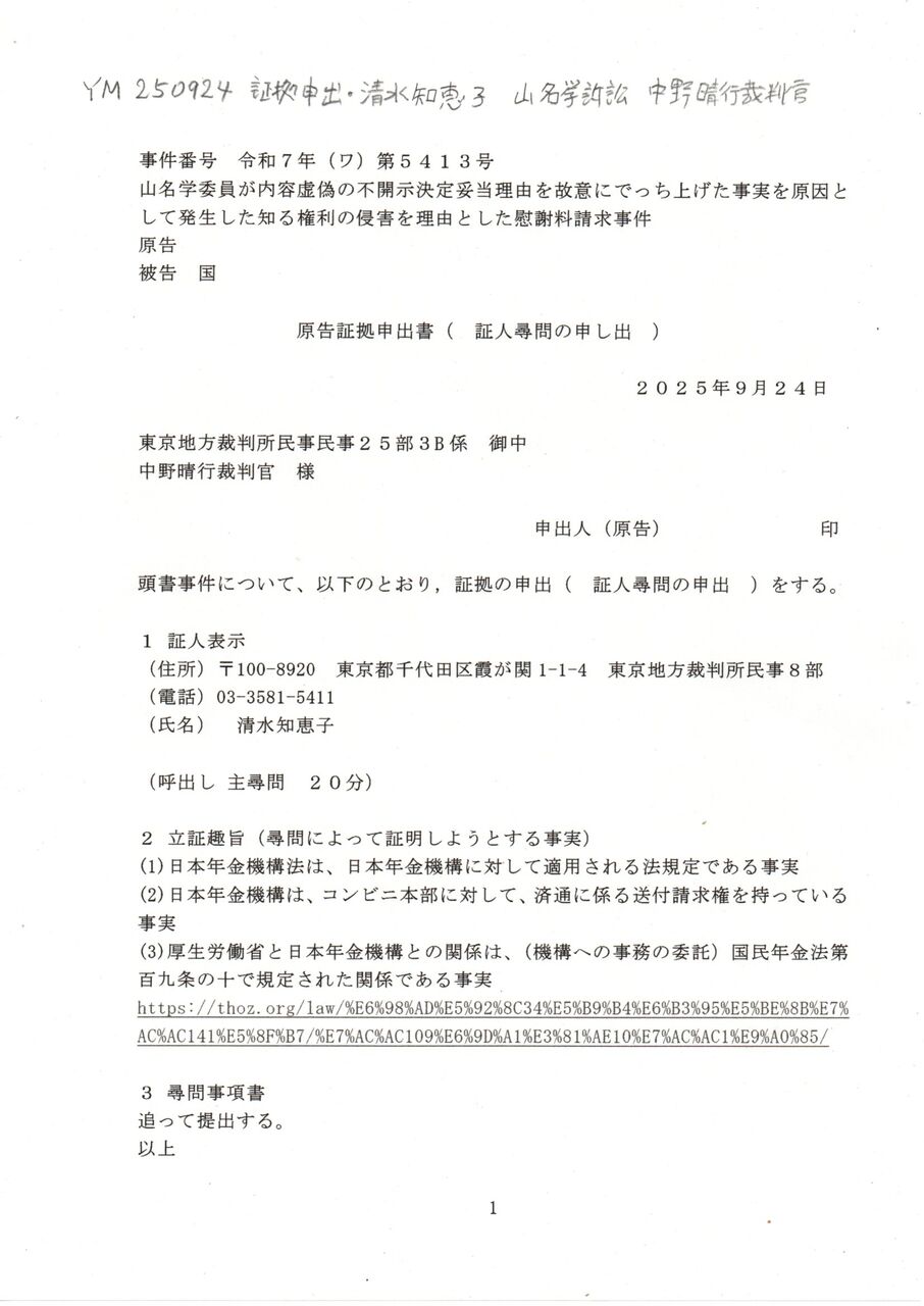 画像版 YM 250924 証拠申出書・清水知恵子 山名学訴訟 中野晴行裁判官 吉田隆一上席訟務官