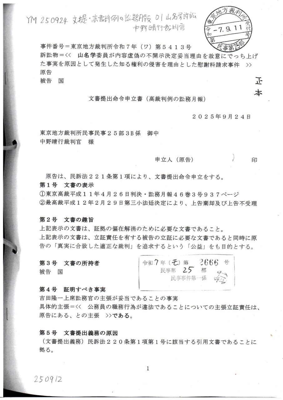 事件番号押印済み YM 250924文書提出命令申立 高裁判例の訟務月報 山名学訴訟 中野晴行裁判官 吉田隆一上席訟務官