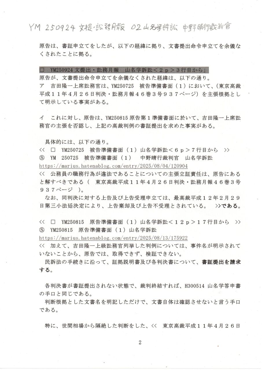 □ YM250924文提出・訟務月報 山名学訴訟<2p>3行目から」