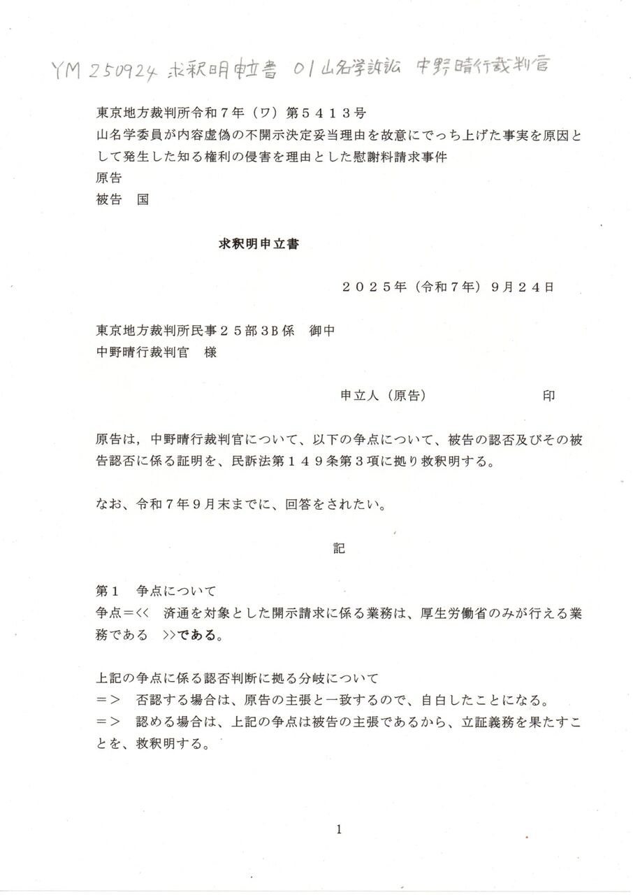 1 YM 250924 救釈明申立書 01山名学訴訟 中野晴行裁判官