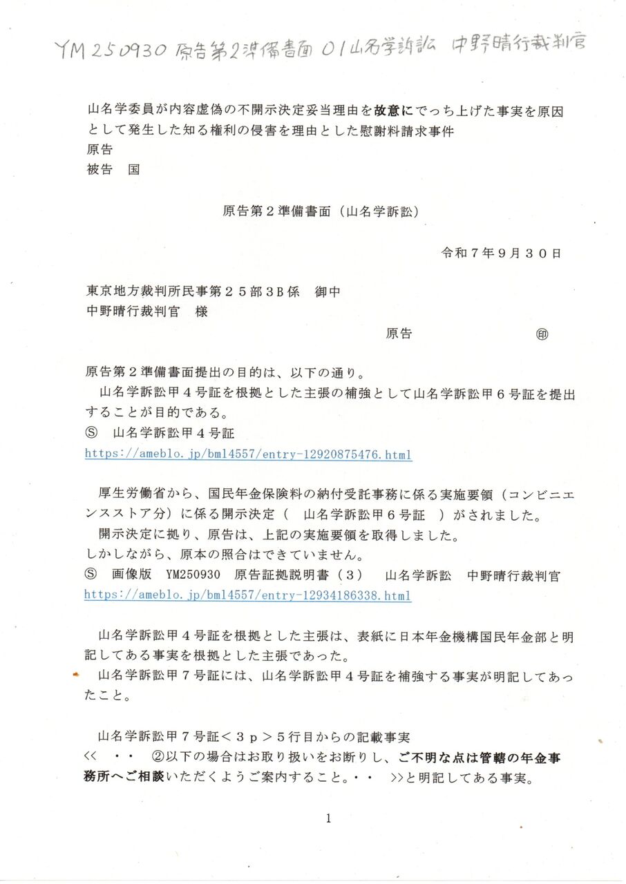 1 YM 250930 原告第2準備書面 01山名学訴訟