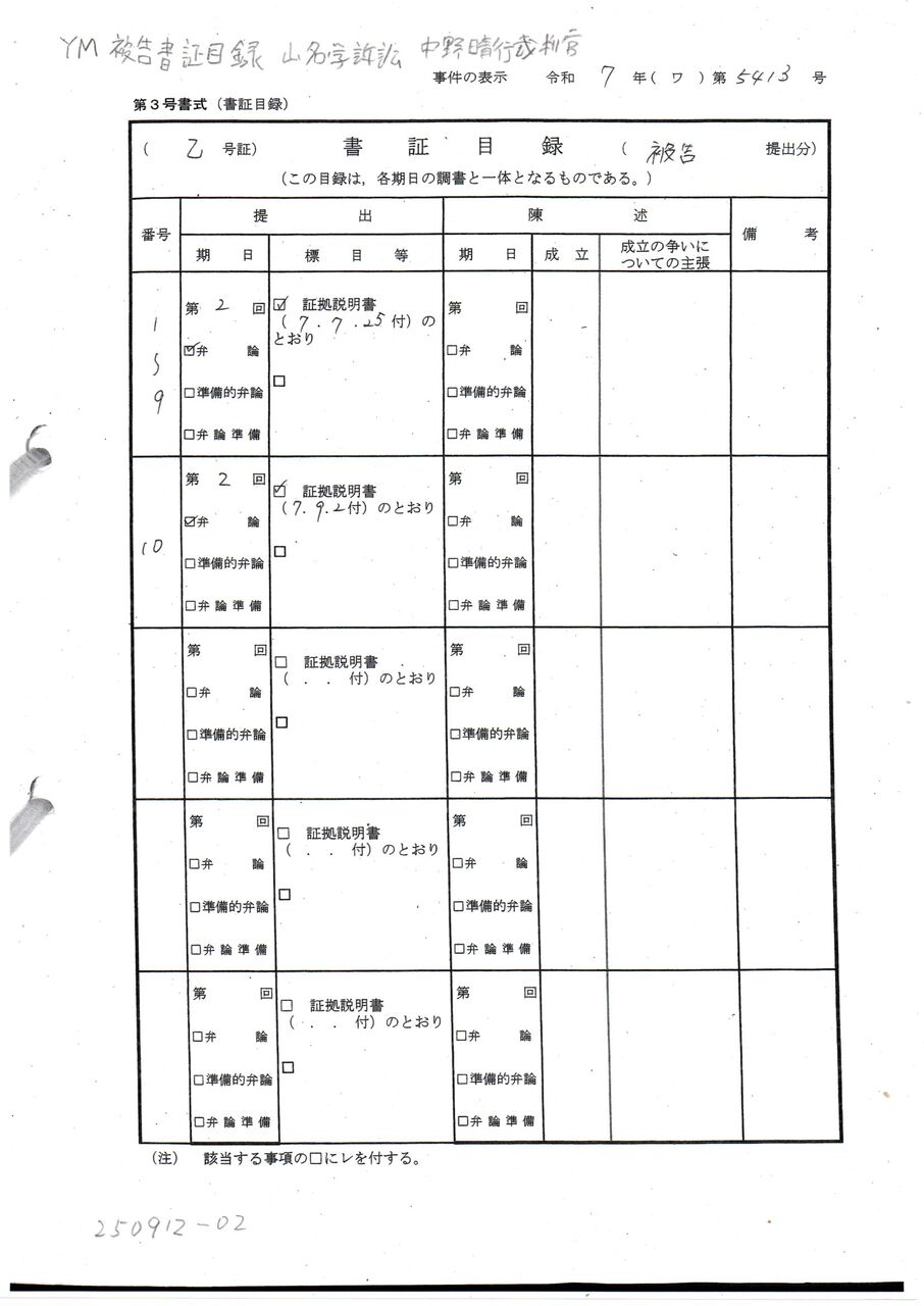 2 YM 被告書証目録等 山名学訴訟 中野晴行裁判官