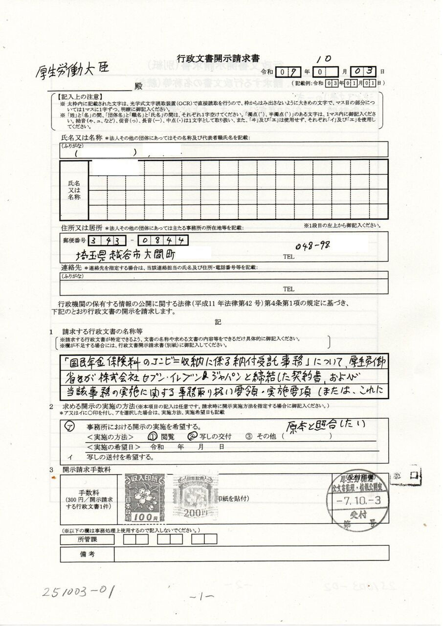 上記の開示請求に対して、年金機構は厚生労働省に、コンビニ本部が年金機構に対して、納付済通知書原本を送付するように依頼し、依頼を受けたコンビニ本部は、年金機構に送付すること。