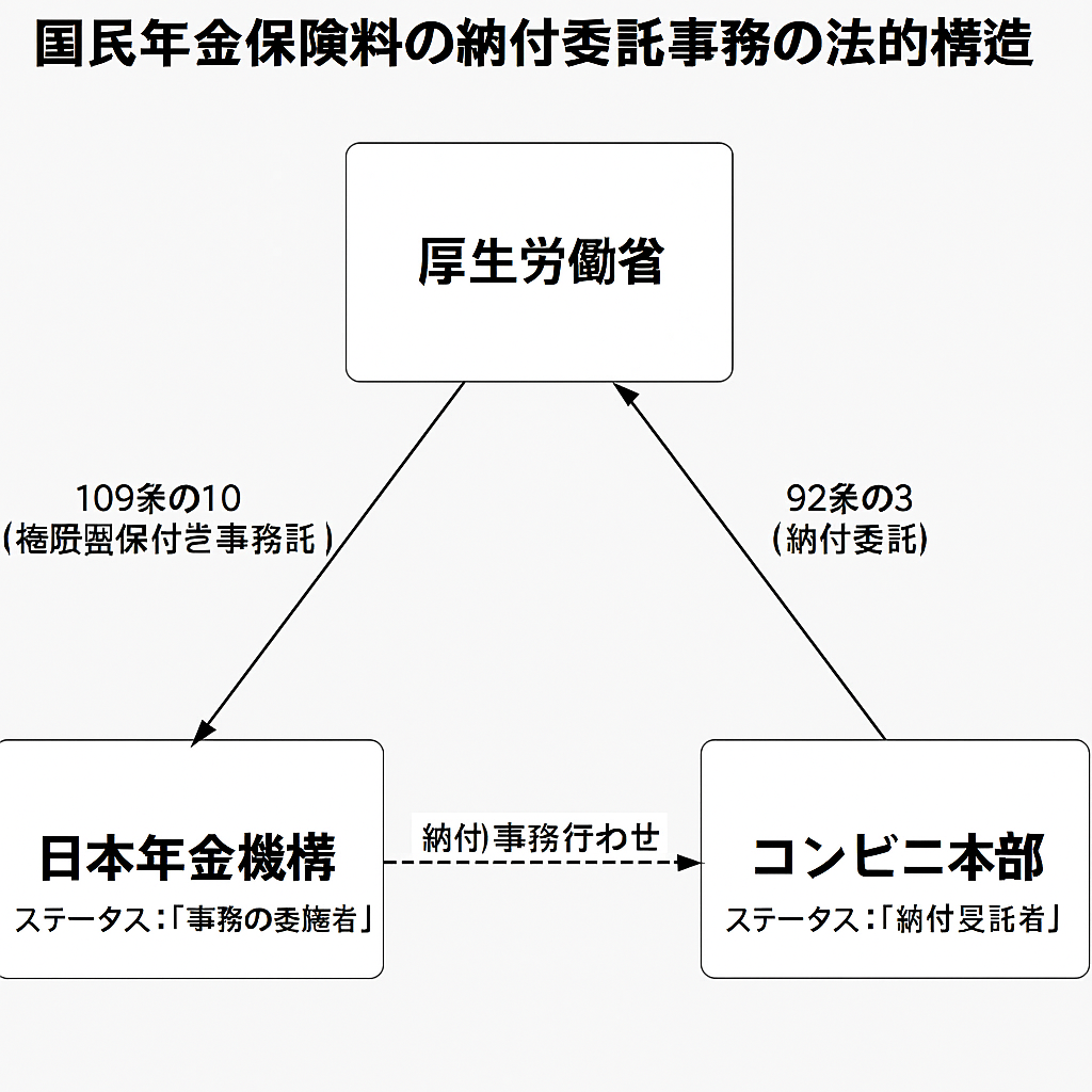 この関係は、厚労省が「契約の親」で、年金機構が「事務の代理人」、コンビニ本部が「契約上の収納者」。