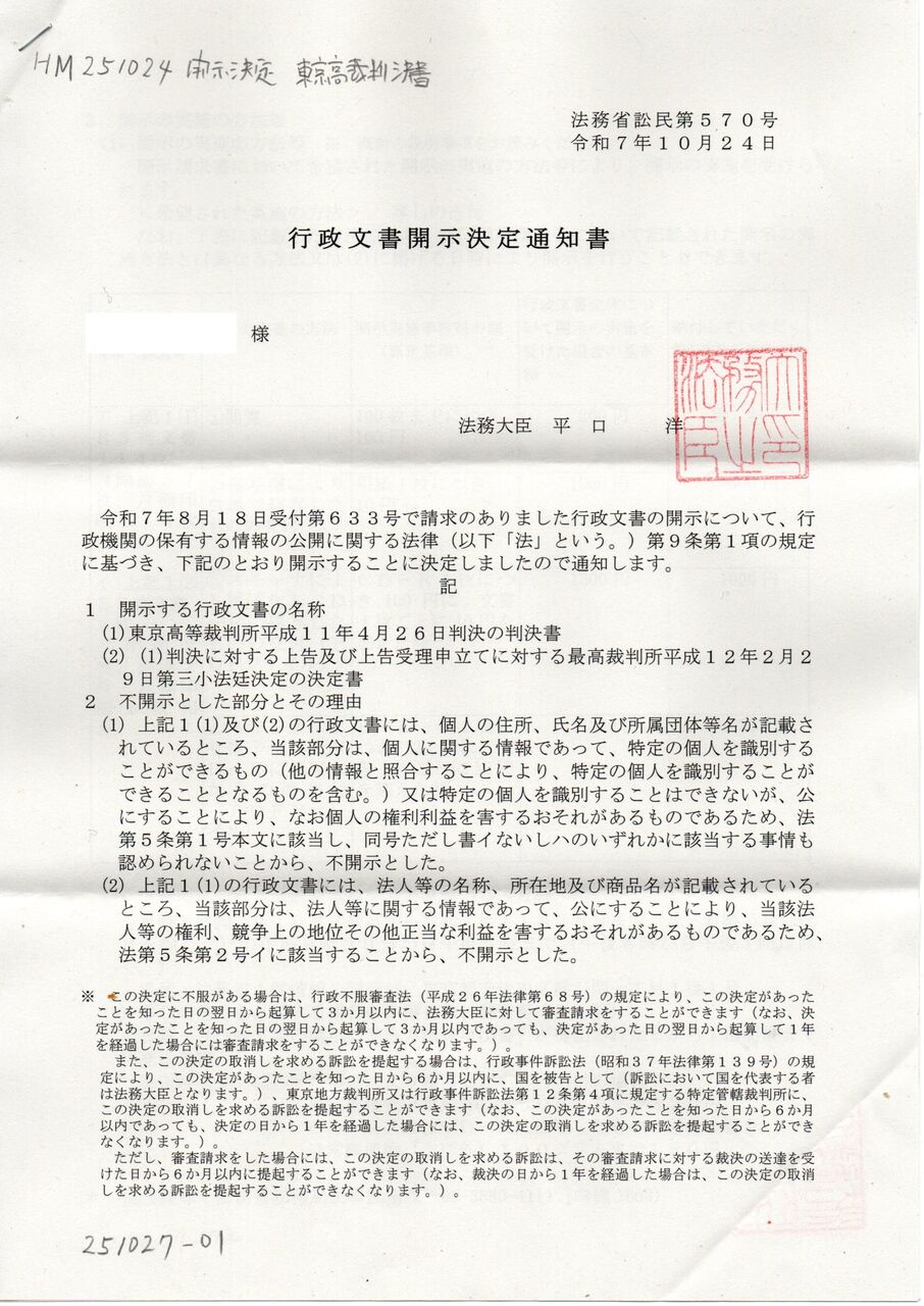 画像版 HM 251024 開示通知 東京高裁判例 H110426判決書 山名学訴訟