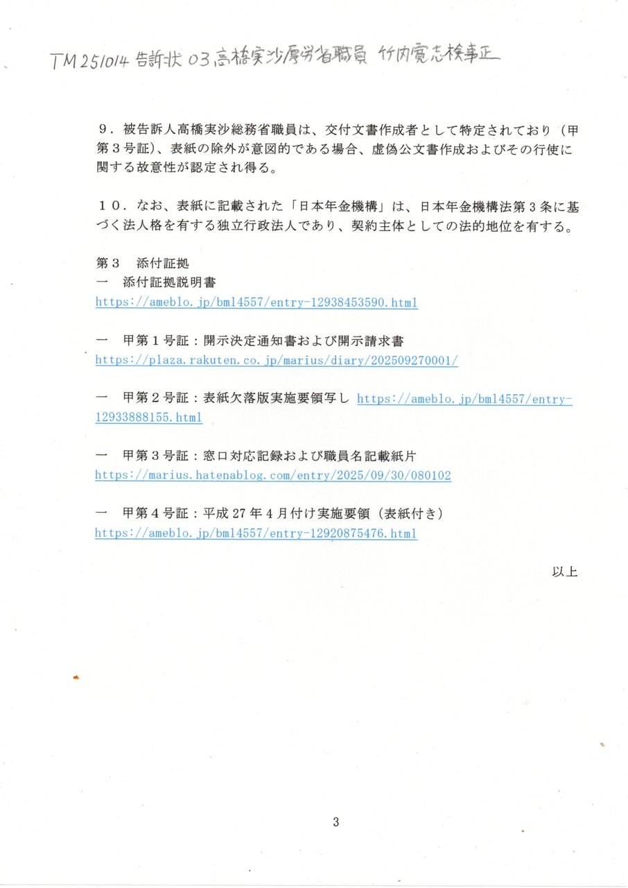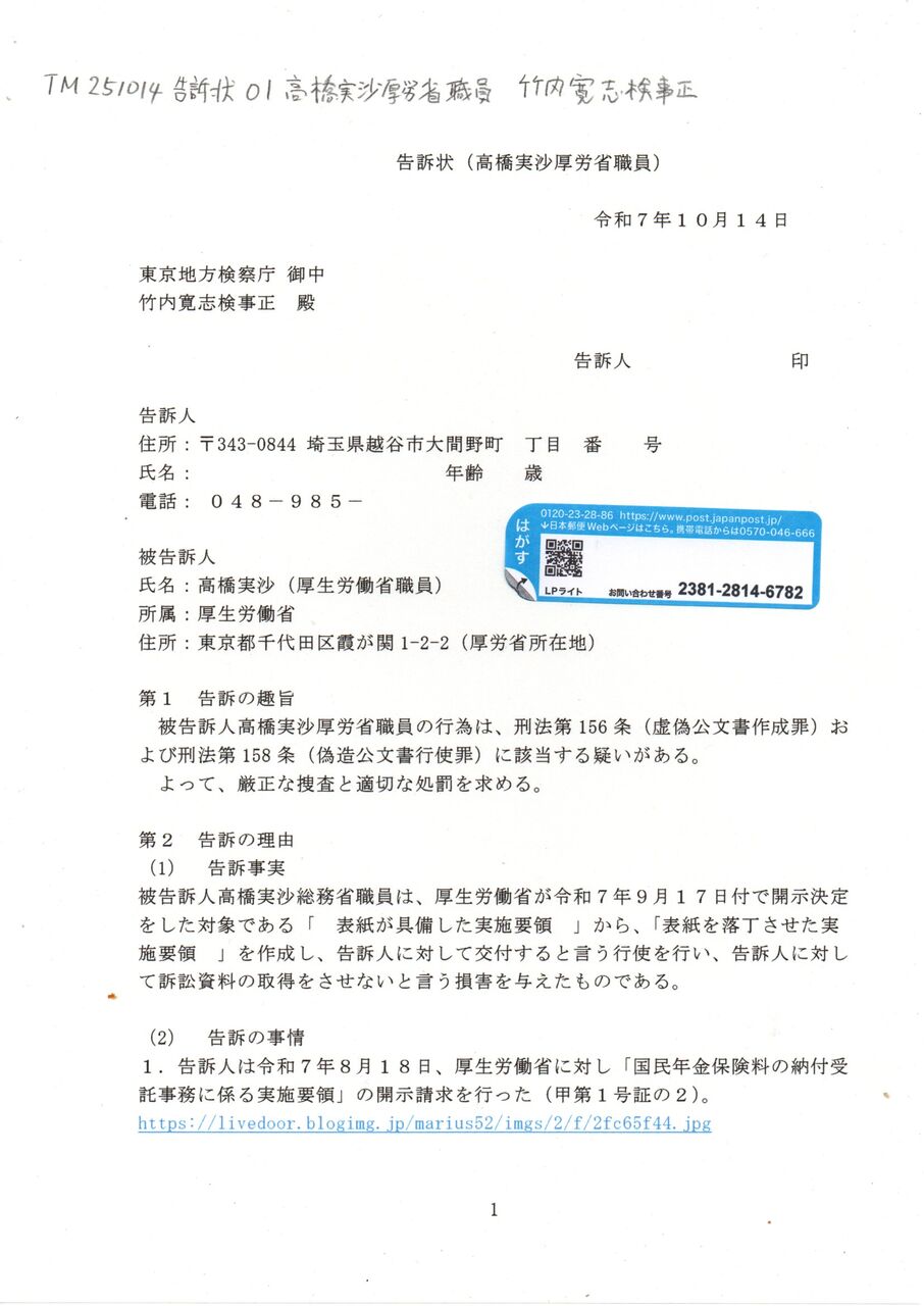 画像版 TM 251014 告訴状 虚偽公文書行使罪 高橋実沙総務省職員 竹内寛志検事正