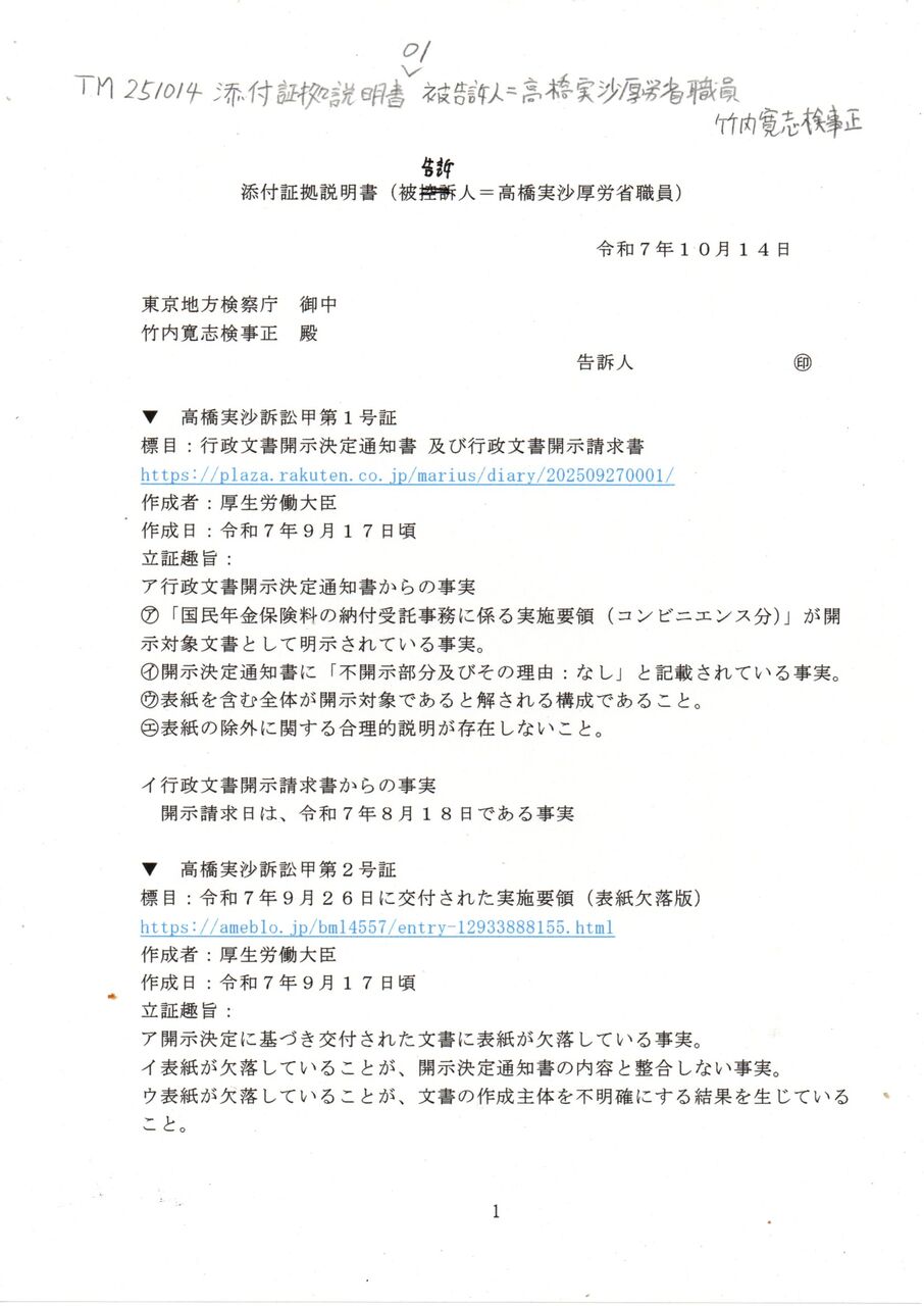 1 TM 251014 添付証拠説明書 01高橋実沙厚労省職員
