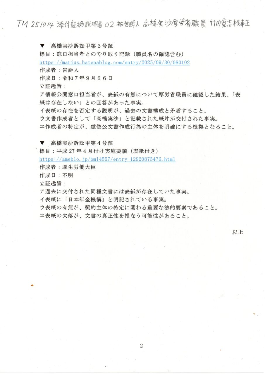 2 TM 251014 添付証拠説明書 02高橋実沙厚労省職員