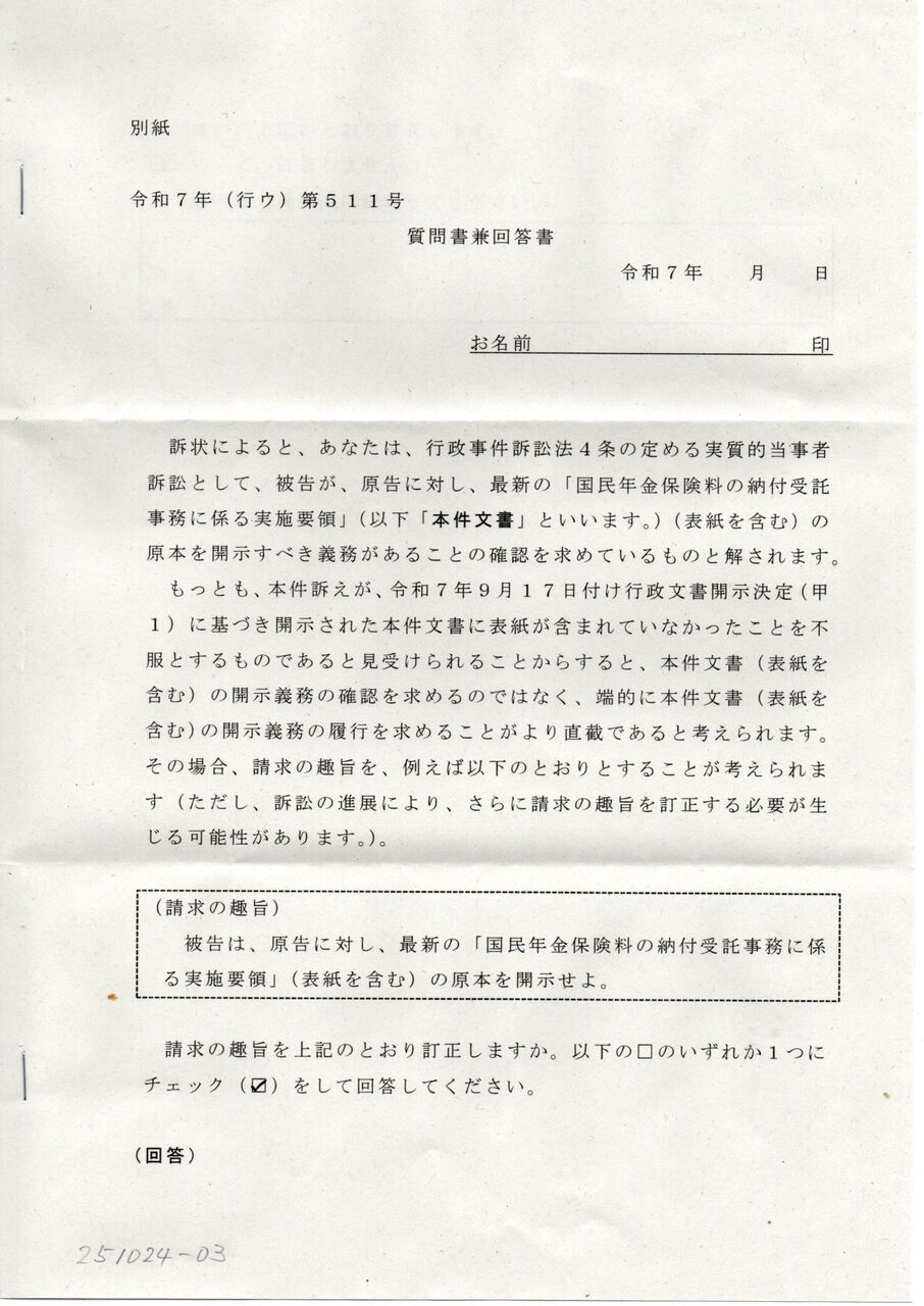 訴状によると、あなたは、行政事件訴訟法4条の定める実質的当事者訴訟として、被告が、原告に対し、最新の「国民年金保険料の納付受託事務に係る実施要領」(以下「本件文書」といいます。)(表紙を含む)の原本を開示すべき義務があることの確認を求めているものと解されます。