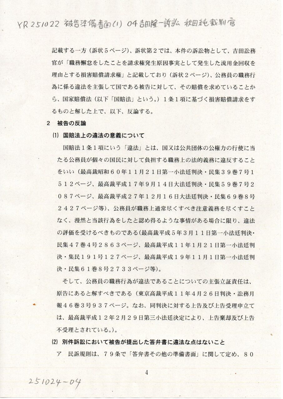 4 YR 251022 被告準備書面(1) 04吉田隆一訴訟 秋田純裁判官