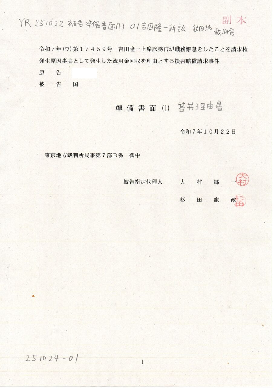 Ⓢ YR 250912 答弁書 吉田隆一訴訟 大村郷一訟務支援専門官