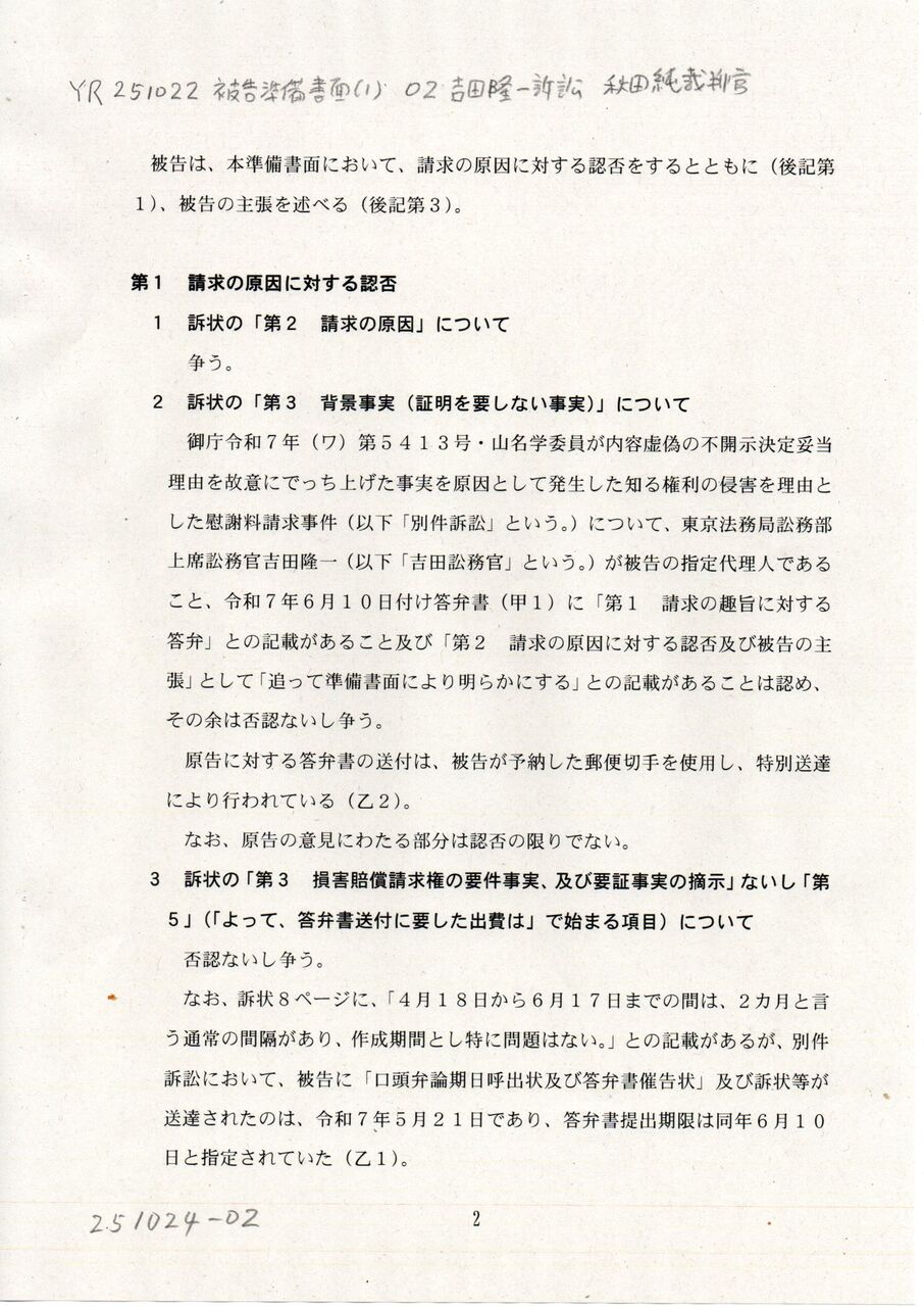 2 YR 251022 被告準備書面(1) 02吉田隆一訴訟 秋田純裁判官