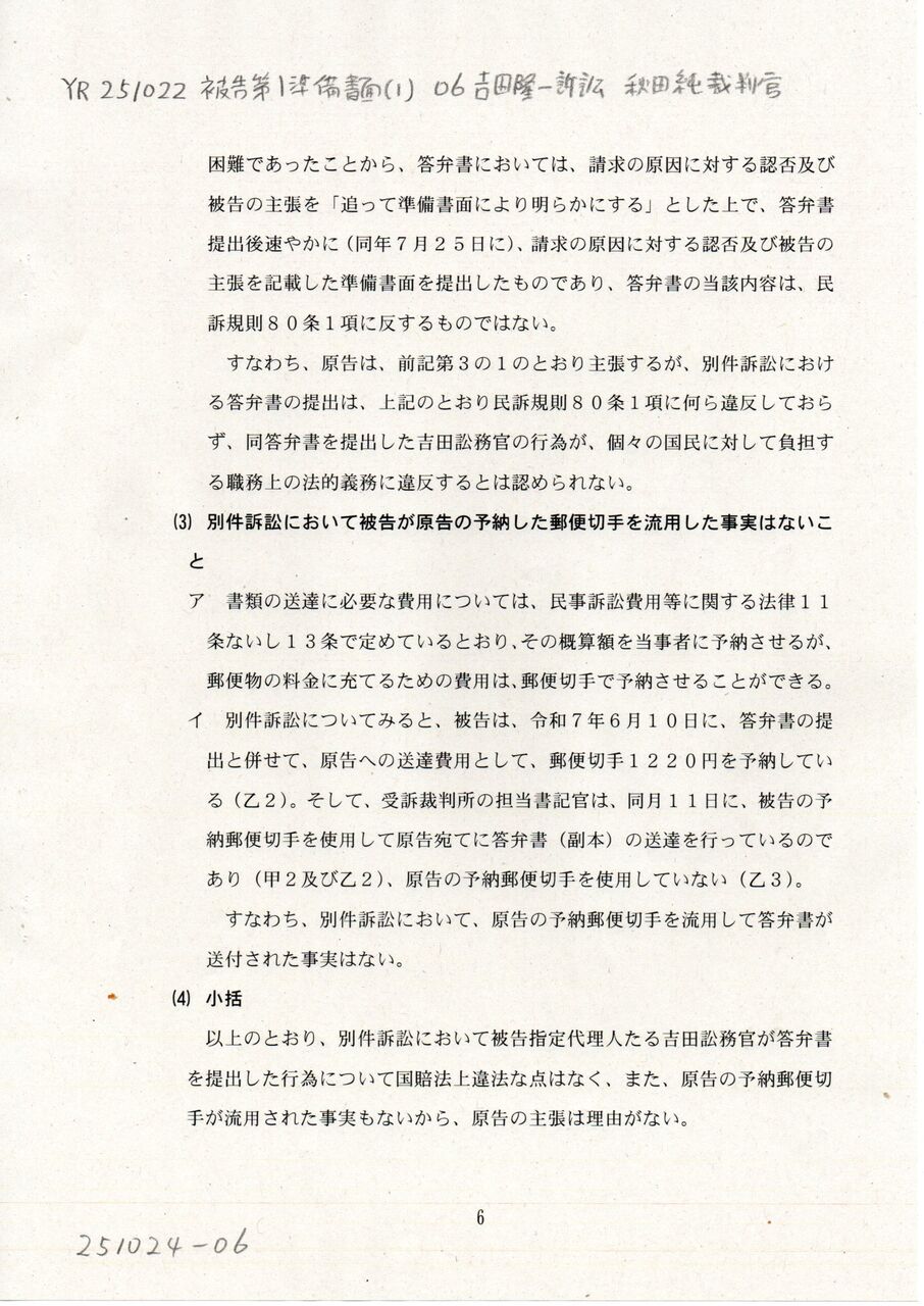 6 YR 251022 被告準備書面(1) 06吉田隆一訴訟 秋田純裁判官