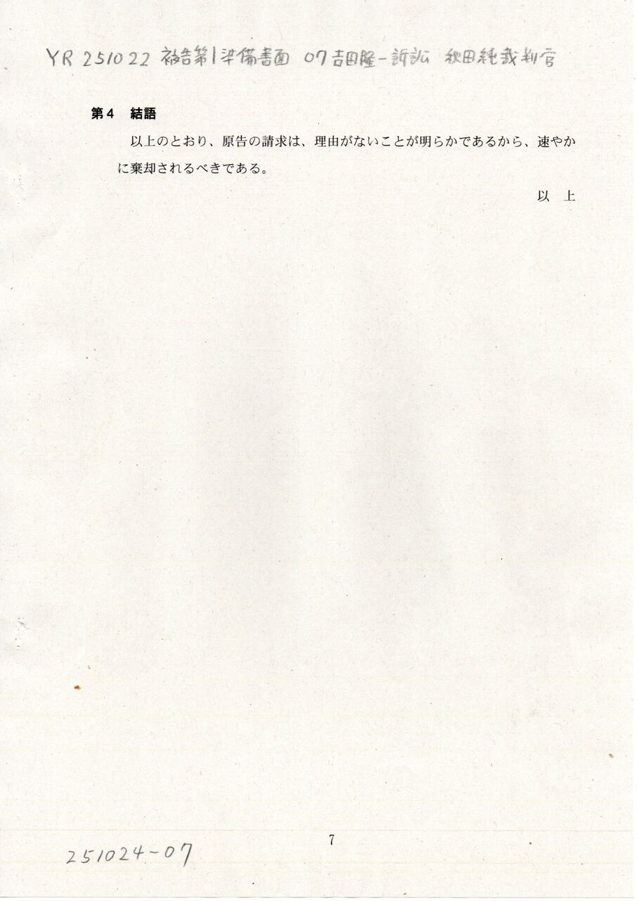 7 YR 251022 被告準備書面(1) 07吉田隆一訴訟 秋田純裁判官